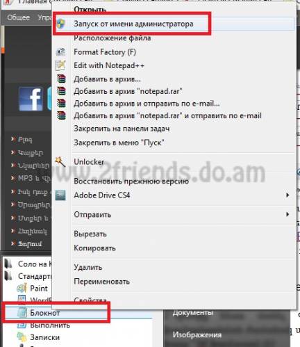 1.Մտնել Start>Стандартные և բացել բլոկնոտը ադմինիստրատորի անունից