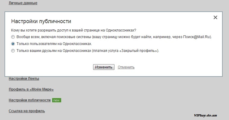 | Օդնոկլասնիկի կայքում վերջերս նկատաց կլինեք, որ հանել էին պրոֆիլները փակելու կոճակը: Եթե չգիտեք ասեմ, որ այդ ֆունկցիան օդնոկլասնիկի կայքում վճարովի է: Այսօր նկատեցի, որ Օդնոկլասնիկի ադմինիստրացիան նորից վերադարձրել է այդ ֆունկցիան: Պրոֆիլները միայն ընկերների համար հասանելի դարձնելու համար անհրաժեշտ է մտնել այստեղ և սեղմել Настройки публичности: Այդտեղ առաջարկվելու է 3 տարբերակ ընտրեք ձեզ հարմար տարբերակը և սեղմեկ Изменить: